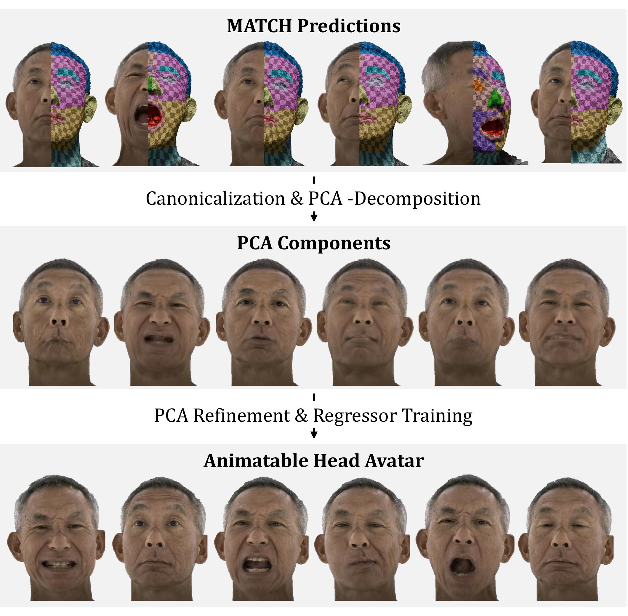 Beyond static 3D reconstruction, MATCH accelerates the creation of lightweight, animatable GEM avatars by a factor of 10.
