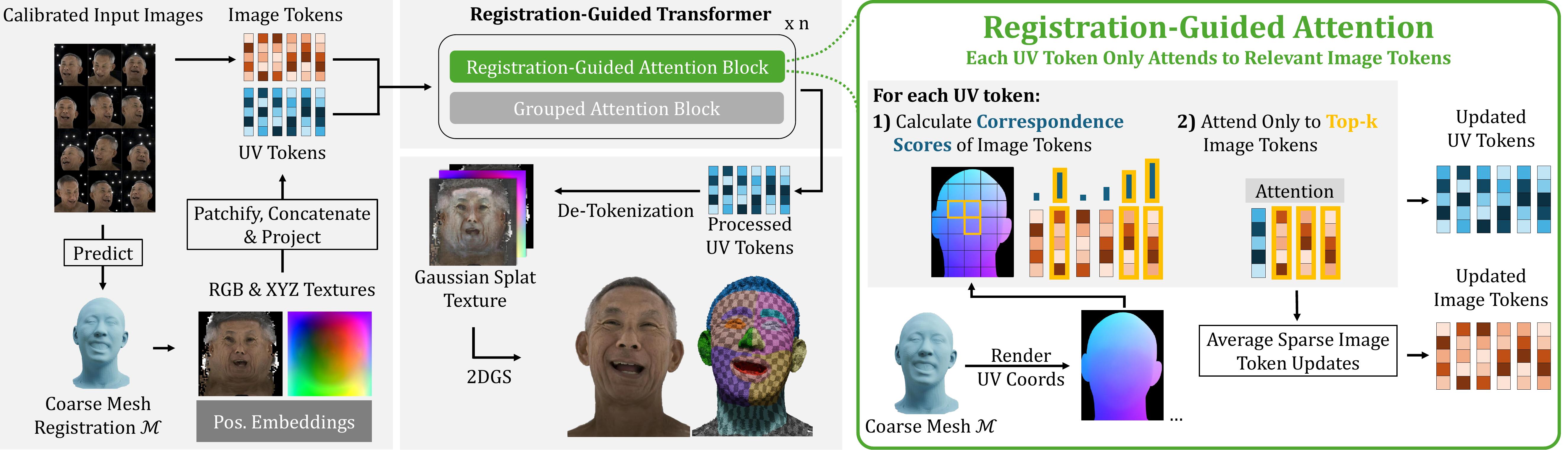To achieve this, we introduce a novel registration-guided attention block, where each UV-map token attends exclusively to image tokens depicting its corresponding mesh region. This design improves efficiency and performance compared to dense cross-view attention. MATCH outperforms existing methods in novel-view synthesis, geometry registration, and head avatar generation, while making avatar creation 10 times faster than the closest competing baseline.